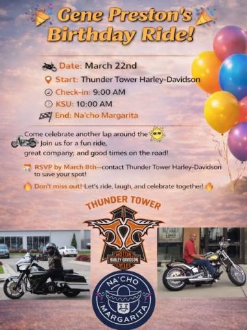 Join us on March 22nd to celebrate TTHD Owner Gene Preston's birthday with a ride from Thunder Tower to Na'cho Margarita.